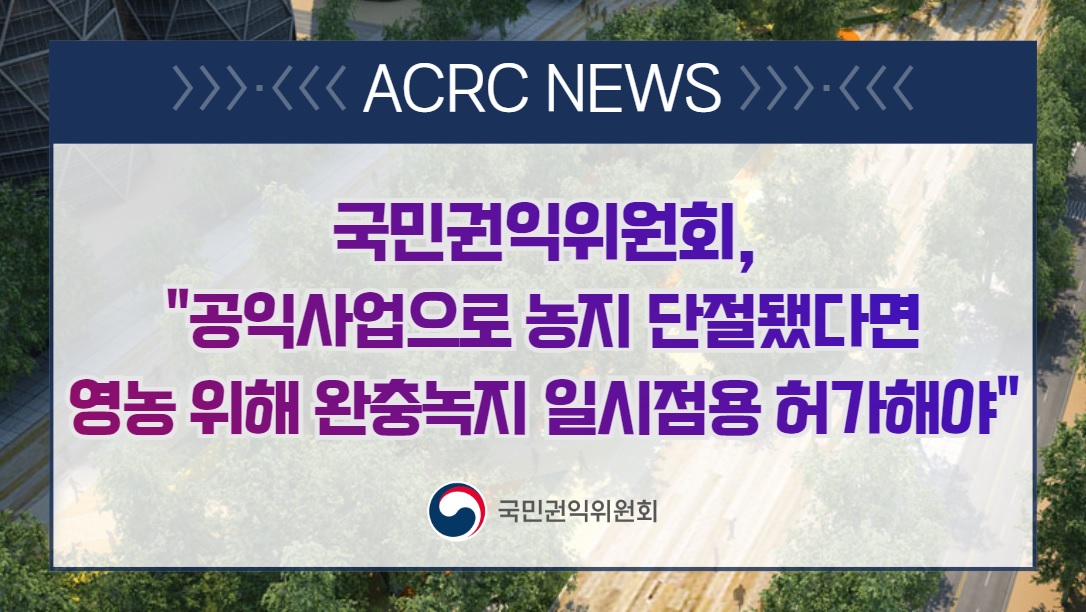 국민권익위원회는 현장조사와 A씨 면담, 이해관계자 제출 자료 등을 통해 ○○부 징계의 부당성을 심의했다. 조사 결과 토지보상법*은 토목사업 시행으로 농사를 지을 수 없을 때 보상 대신 도로 공사를 할 수 있다고 규정하고 있다. 녹지를 통한 진입도로의 설치는 “공원녹지법**”의 진입허가 대상인 것으로 확인되었습니다. * 공익사업 등을 위한 토지의 취득 및 보상에 관한 법률 ** 도시공원녹지 등에 관한 법률 택지개발사업 이전인 1998년부터 이 농지의 농업지원과를 경작해온 A씨는 이에 따라 발생하는 교통사고 예방 및 민원 예방을 위해 농지주변 차량대수를 늘렸으나, 국민권익위원회는 농기계 출입시 임시점용허가가 필요하다고 판단하고 시의 임시승인을 권고하고 있다. ○○지역 완충녹지 일부 점유. 7494 ▼보도자료 다운로드▼ 첨부파일(230320) 국민권익위원회, “공익사업을 위해 농지를 개간할 경우 농경을 위한 완충녹지의 일시사용을 허가해야 한다.” .hwp 파일 다운로드 내 컴퓨터에 저장네이버에 저장 마이박스