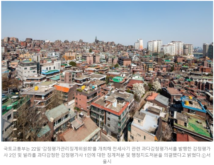 국토교통부는 22일 ‘감정평가관리 징계위원회’를 열고 전세 사기와 관련해 과도한 감정평가서를 발행한 감정인 2명과 별장을 과대평가한 감정인 1명에 대해 징계 및 행정지도를 하기로 했다.