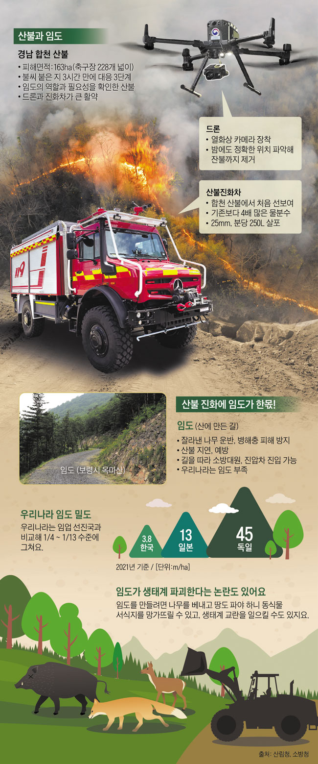 합천 산불 진화에는 드론과 산불소화기 뿐만 아니라 ‘린도’도 큰 역할을 했다는 의견이 이어졌다. 남성현 산림청장은 9일 “산에 숲길이 있다.