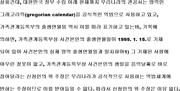 생년월일 정정을 원하는 이유는 다양합니다.실제 연령보다 적거나 많이 등록된 경우, 나쁜 사주팔자, 조기취학, 혼인관계 등이 얽혀 생년월일을 실제 생년월일과 다르게 신고한 경우 등입니다. 특히 예전에는 일상에서 음력을 사용하는 경우가 많아 출생신고 시 음력으로 신고하는 경우가 많았습니다. 음력으로 등록한 생년월일, 양력 생년월일로 정정할 수 있습니다.