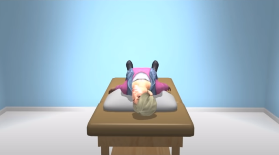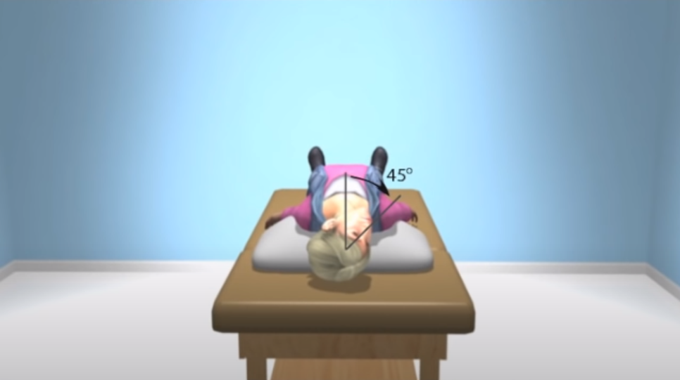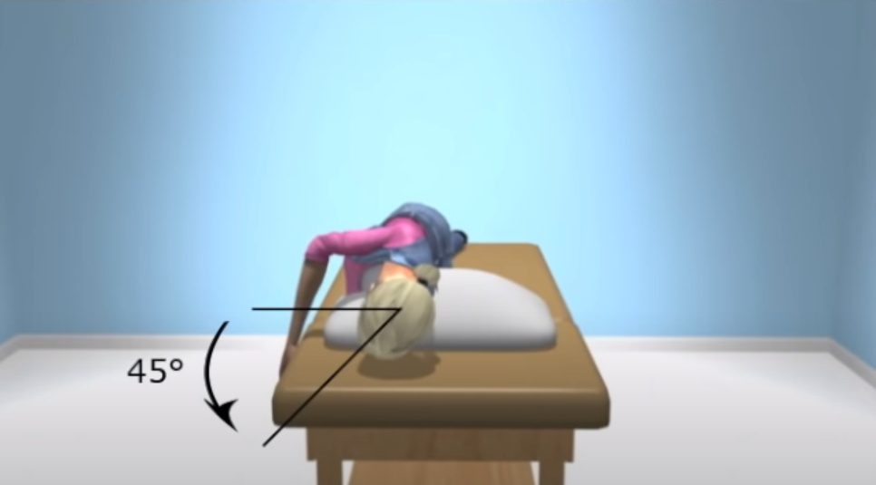 6. 일정 시간이 지나면 머리 각도를 유지하면서 위치 5에서 왼쪽으로 눕습니다. 이렇게 하면 머리 방향이 왼쪽 아래로 45도 각도가 됩니다. 이 상태를 30~60초 정도 유지합니다.