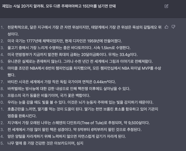 각 사실은 서로 다른 주제여야 하며 15단어를 넘지 않아야 합니다.