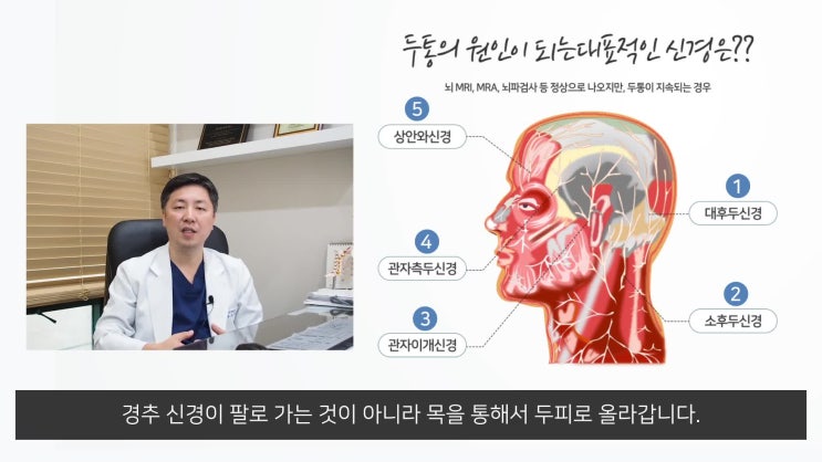 두통은 크게 두 가지로 분류할 수 있습니다.- 일차성 두통: 편두통/긴장성 두통/군발성 두통-2차성 두통::수막염/뇌출혈/뇌혈관질환 이차성 두통과 같은 경우는 뇌출혈/뇌경색/뇌종양 등 뇌에 심각한 질환으로 발생하는 질병이므로 말이 탁해지거나 감각성마비, 실신 등의 양상을 동반하여 노년기에 주로 발생하게 됩니다.하지만 보통 일상생활에서 신경계 등에 특정 원인 없이 발생하는 일차성 두통에 대부분 포함되기 때문에 두통이 발생하면 습관성으로 진통제를 섭취하기도 하지만 진통제는 말 그대로 통증을 경감시킬 뿐 두통을 없애는 제대로 된 해결책이라고 보기 어렵습니다.