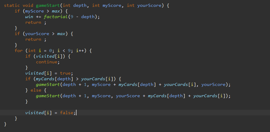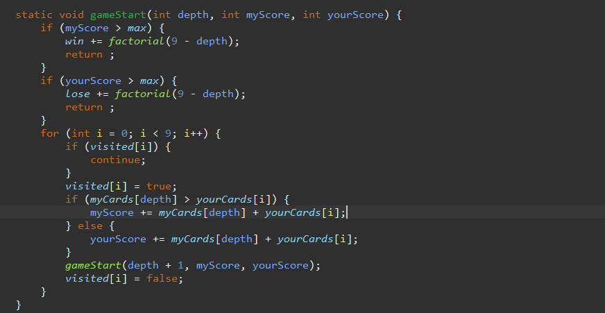 재귀 함수를 사용했는데, 문제에 필요한 myScore(규영 총점)와 yourScore(인영 총점)를 정적 변수로 끌어오지 않고 파라미터로 전달했습니다.