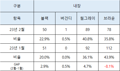 인테리어는 웜그레이, 브라운, 블랙 순으로 선호도가 높다.