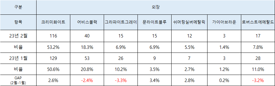 그들 중 절반 이상이 흰색을 선택했습니다. 다만 전월 대비 Shimmering Silver Metallic의 선택률이 소폭 상승했다.