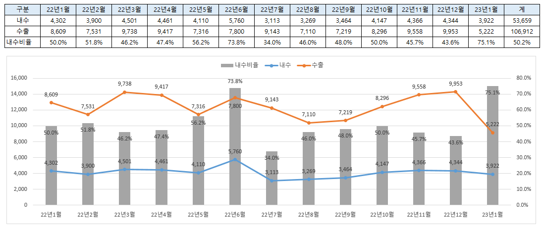 그러다 2023년 1월 수출 물량이 급감했다. 6월 22일 현재 내수비중은 73.8%이나 이는 수출과 내수가 모두 증가한 결과이다.