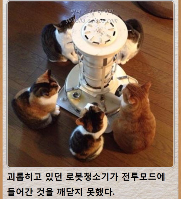 로봇청소기는 고양이들의 괴롭힘을 참지 못하고 전투모드로 돌변한다.