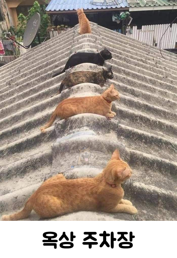 옥상 주차장에 고양이들이 나란히 주차되어 있는 이미지입니다.
